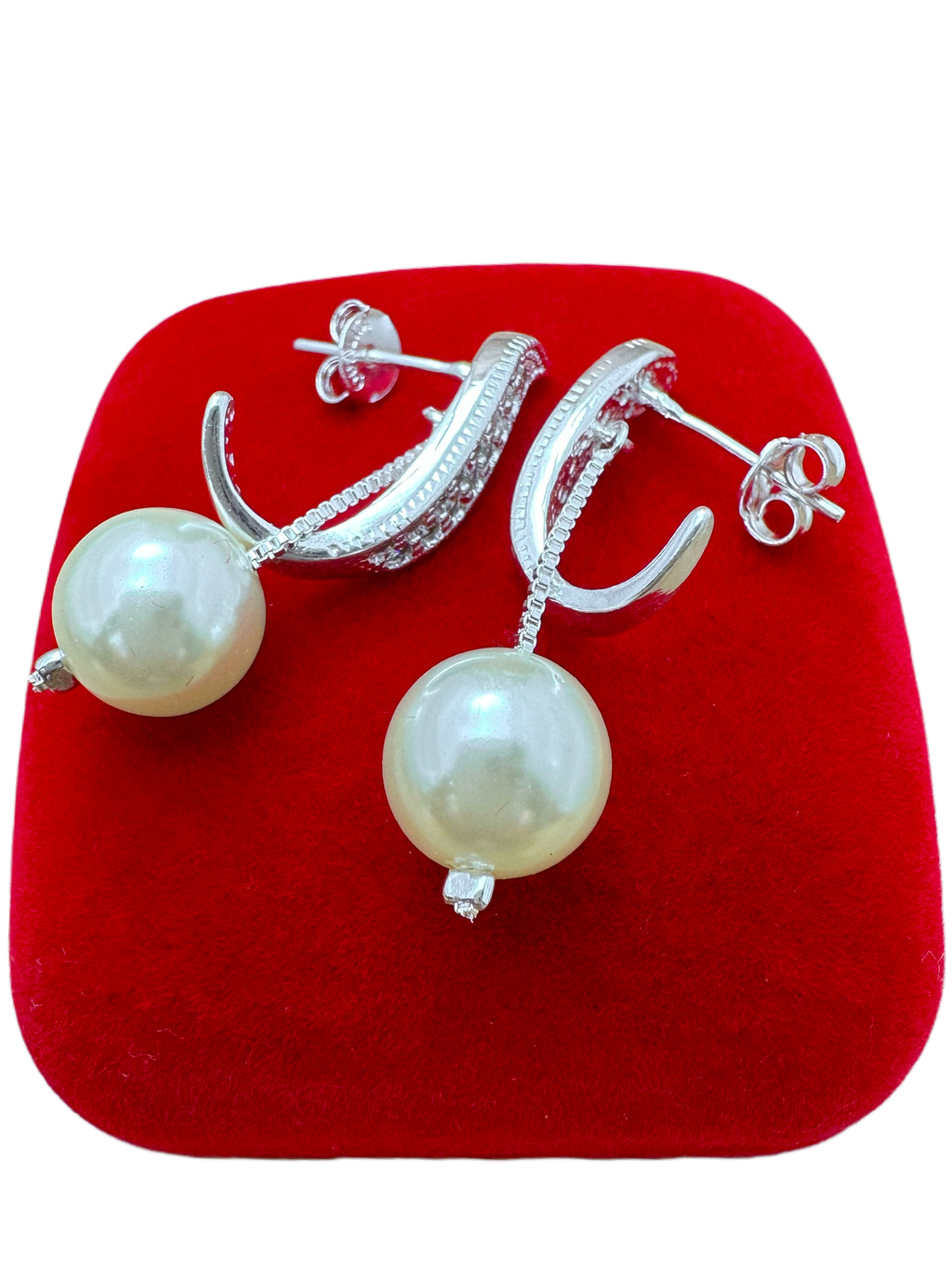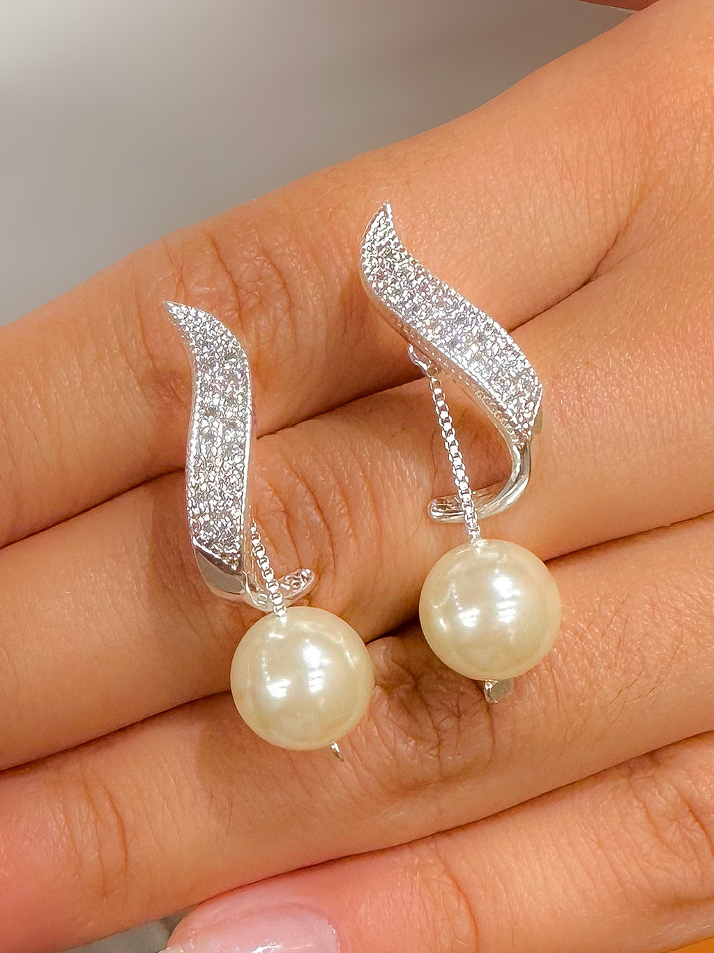 MODELO MÉDIO: Brinco leve balanço com zircônias e pérolas em semijoia folheada a prata.